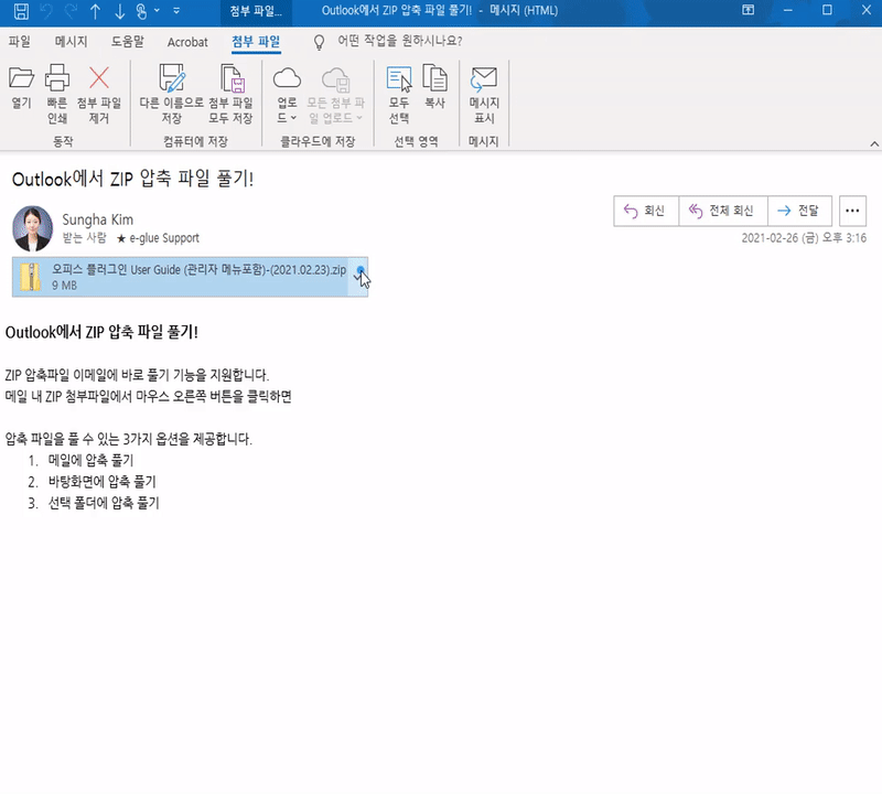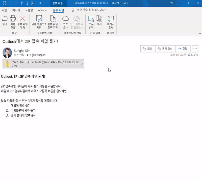 아웃룩 내에서 손쉽게 첨부 파일의 압축 풀기, 저장 및 관리를 손쉽게 할 수 있도록 총 3가지의 압축 풀기 옵션을 제공하고 있습니다.