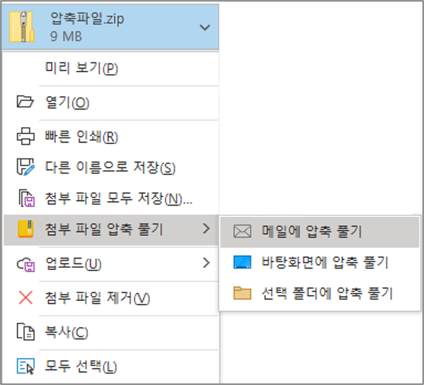 👉 드롭 다운 메뉴에서 첨부 파일 압축 풀기 옵션 중 메일에 압축 풀기를 클릭합니다.
