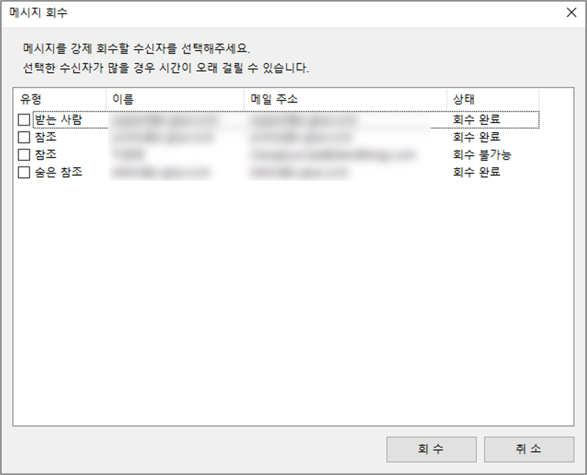 메시지 회수 팝업창이 나타나면 좌측의 유형에 받는 사람과 참조, 숨은 참조로 구분된 수신자 정보가 나타나며 회수 가능 여부를 우측의 상태에서 확인할 수 있습니다. 회수할 대상(수신자)의 ✅체크박스를 선택합니다.