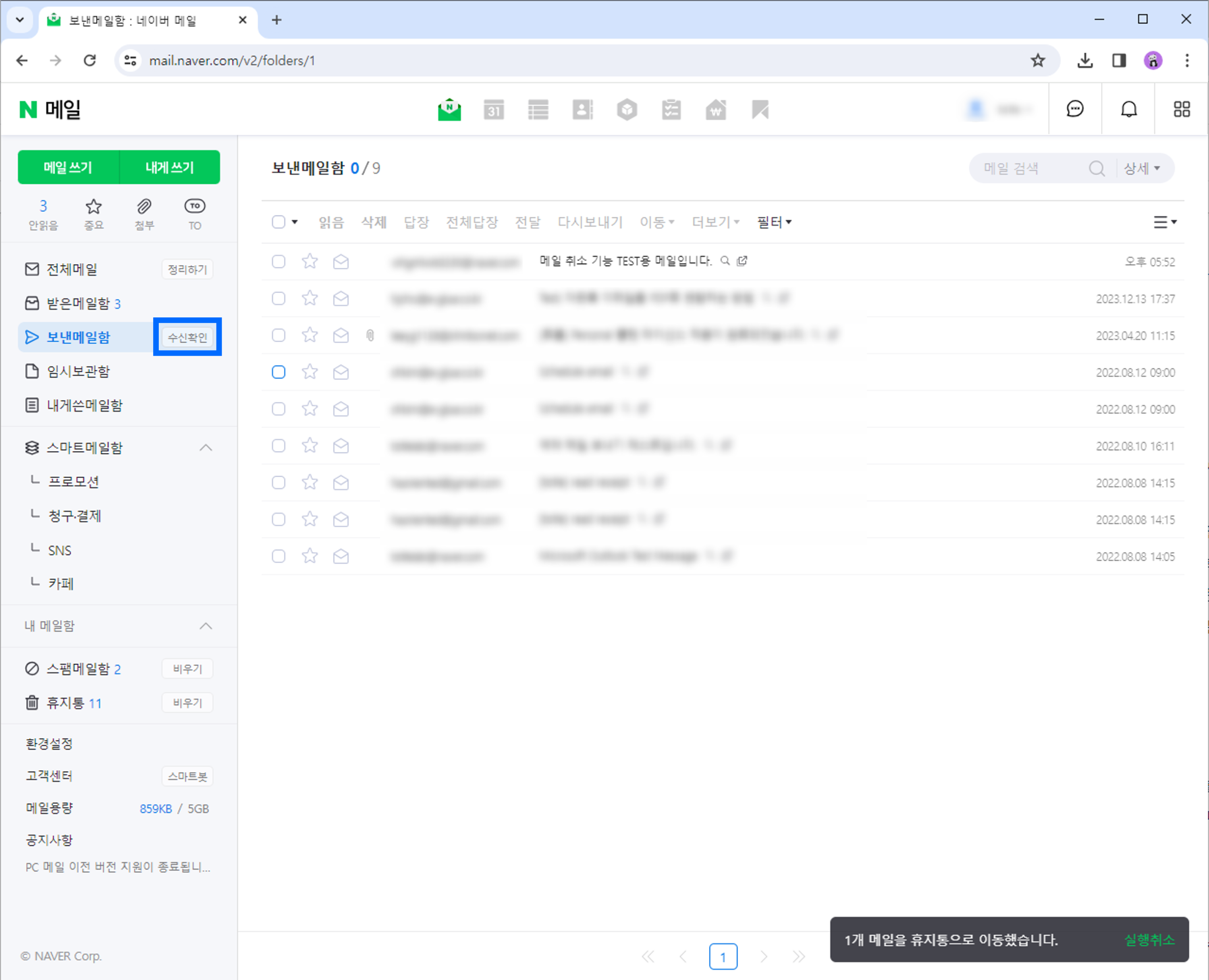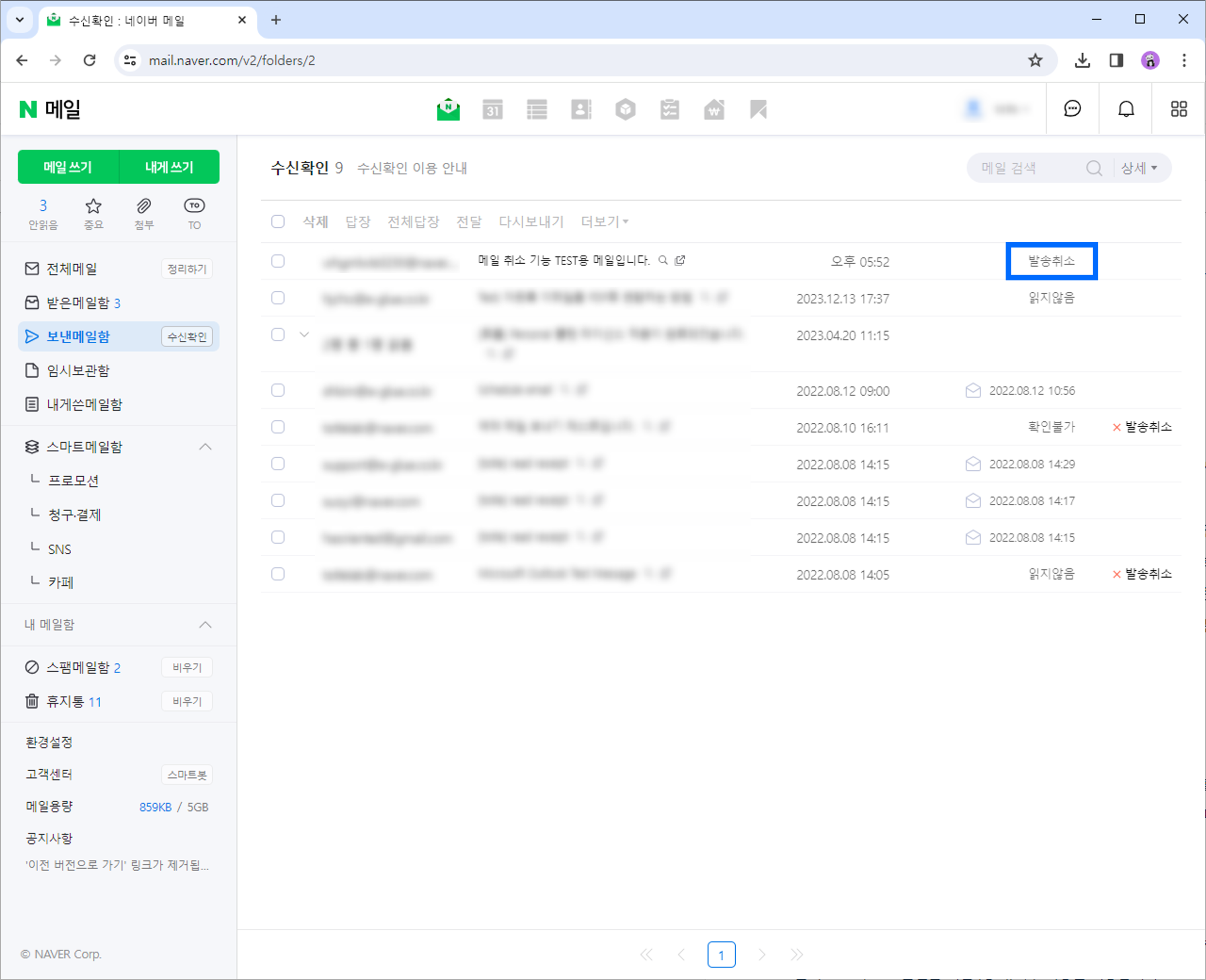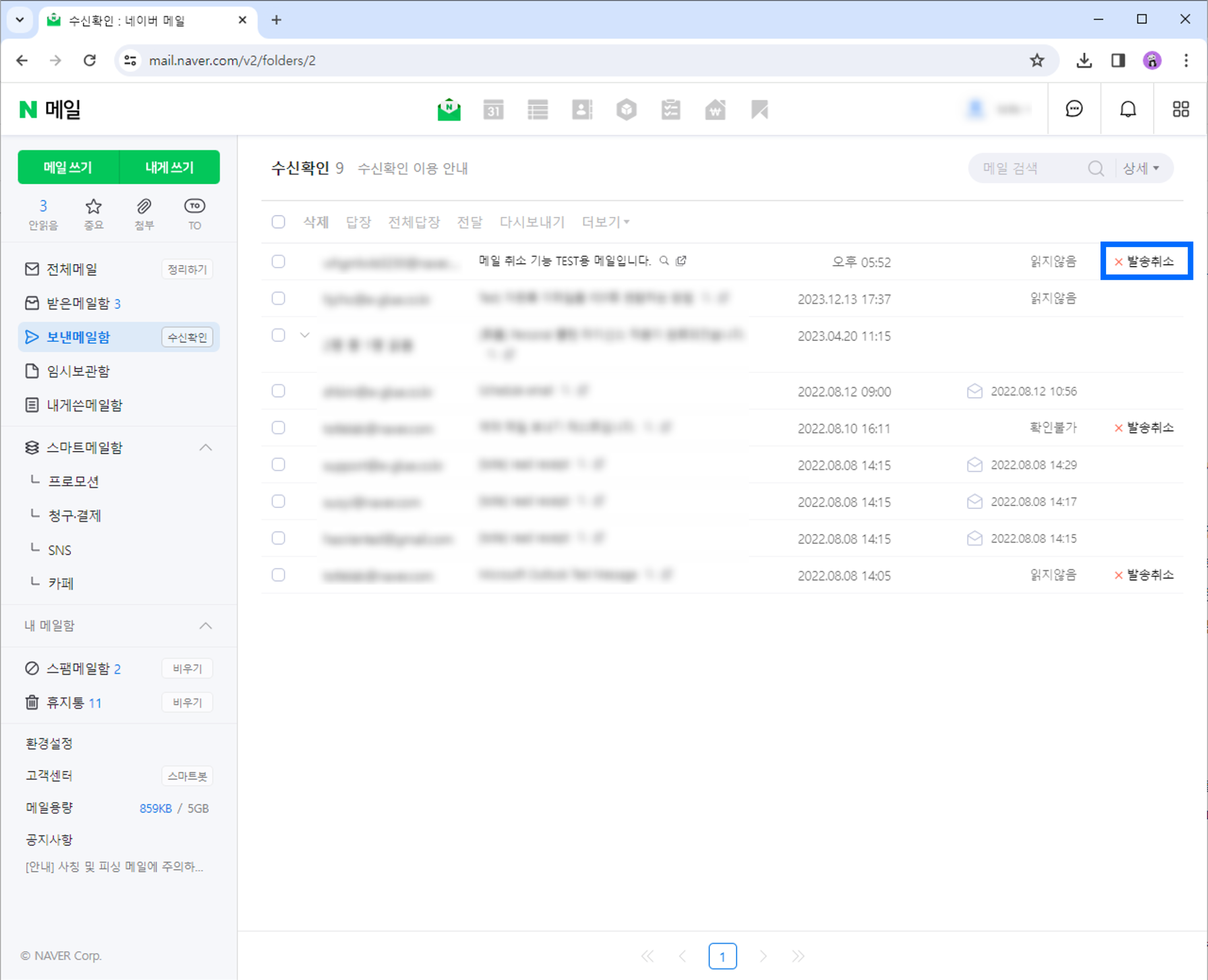 선택한 메일의 발송이 취소된 것을 확인할 수 있습니다. 이로써 네이버 메일의 발송 취소가 완료되었습니다.