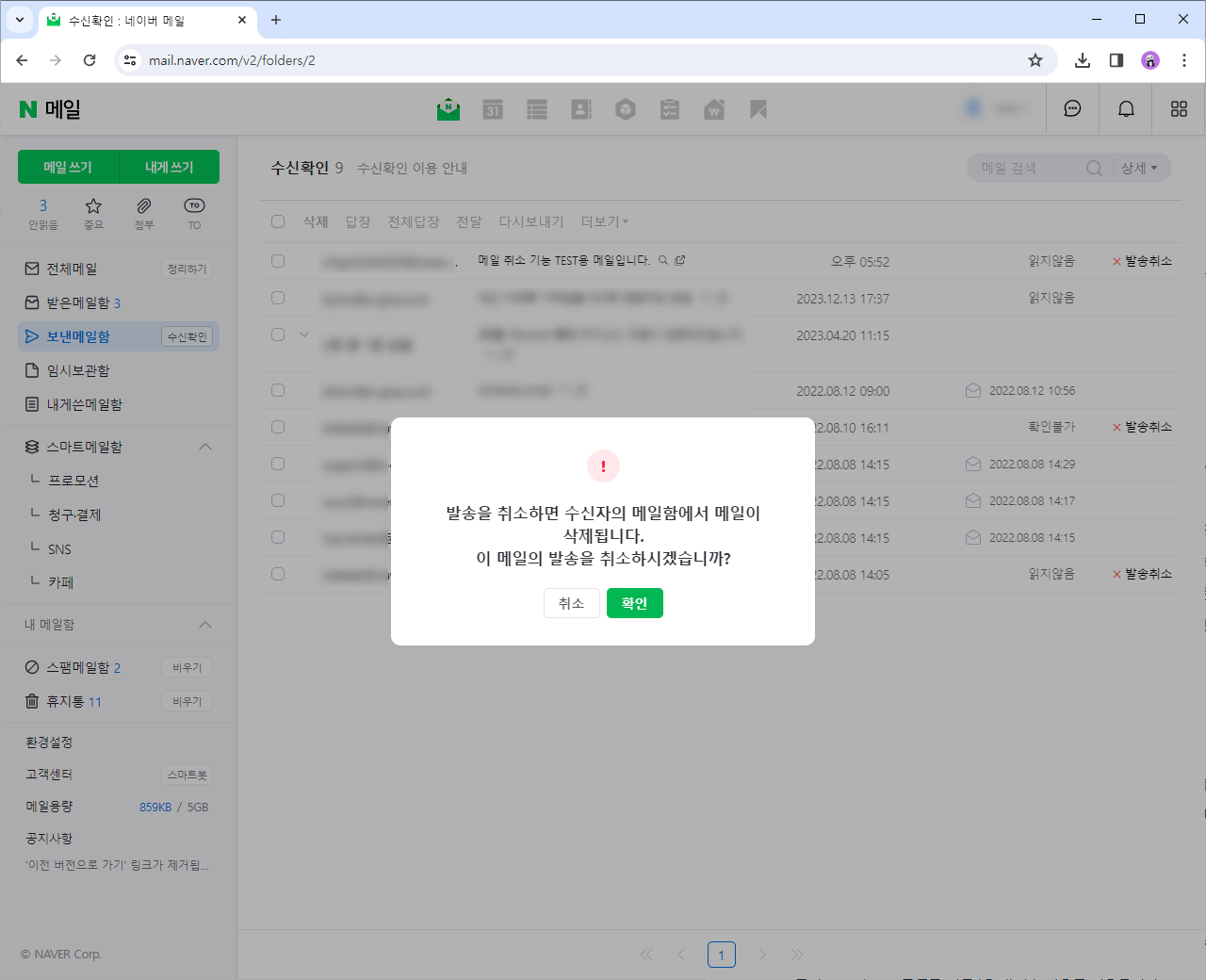 발송취소를 누르면 메일 발송 취소를 확인하는 팝업창이 나타납니다. 확인을 선택합니다.