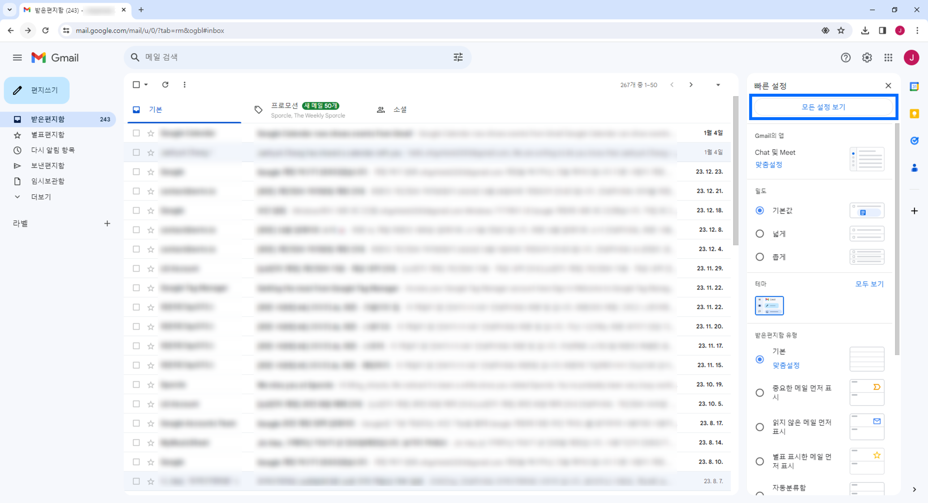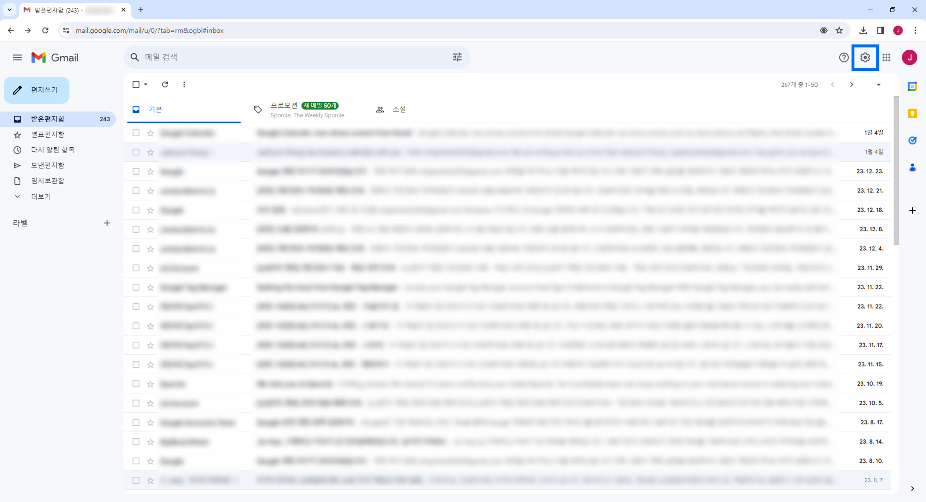 Gmail 홈에서 우측 상단의 ⚙톱니바퀴 아이콘을 찾아 클릭합니다.