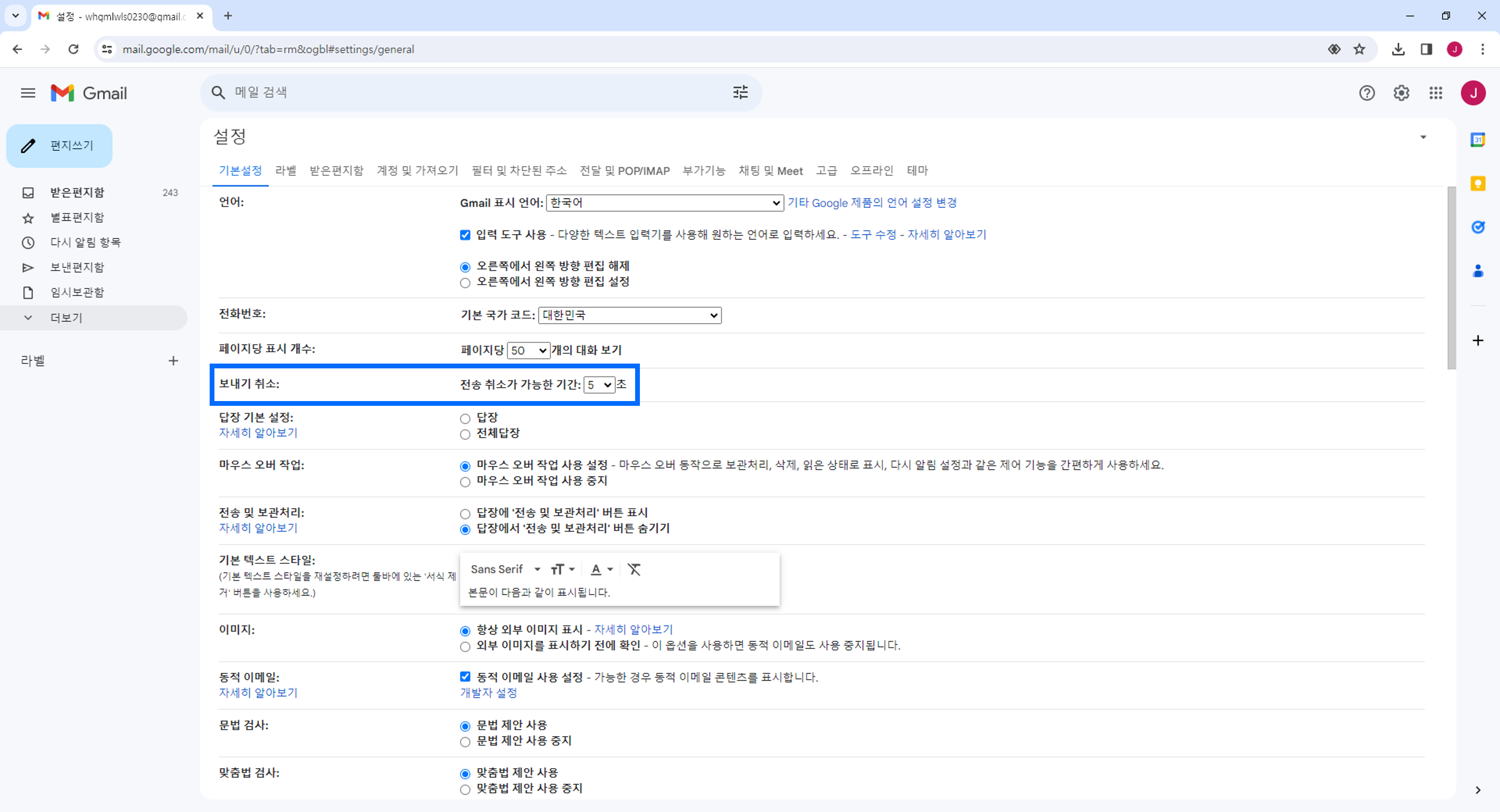 메일 설정의 첫 화면인 기본설정 탭에서 보내기 취소를 발견할 수 있습니다. 기존 5초로 설정되어 있었던 전송 취소가 가능한 기간을 30초(최대)로 늘려줍니다.