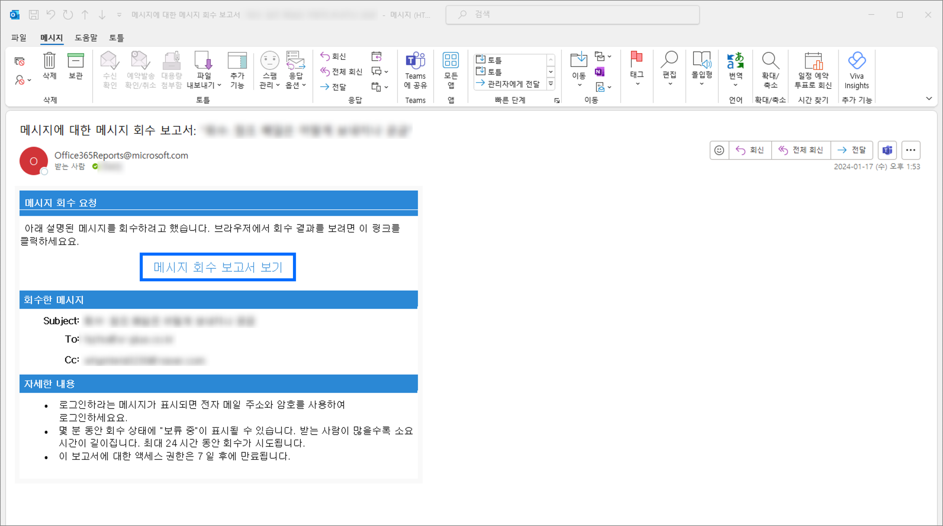 메시지 회수 상태에 대해 더 자세히 알고 싶다면 보낸 이메일에서 메시지 탭 → 토틀 메뉴의 메시지 회수 아이콘을 클릭해 더 상세한 정보를 확인할 수 있습니다.