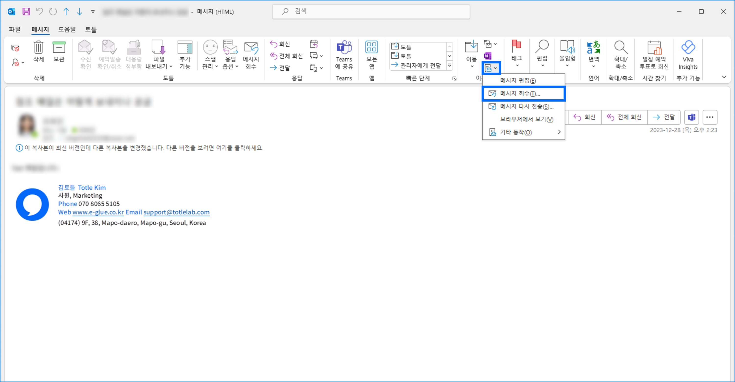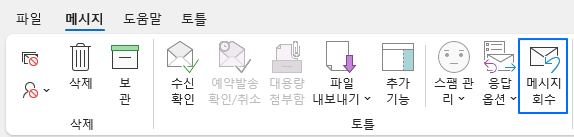 상단의 메시지 탭에서 토틀 메뉴의 메시지 회수 아이콘을 클릭합니다.