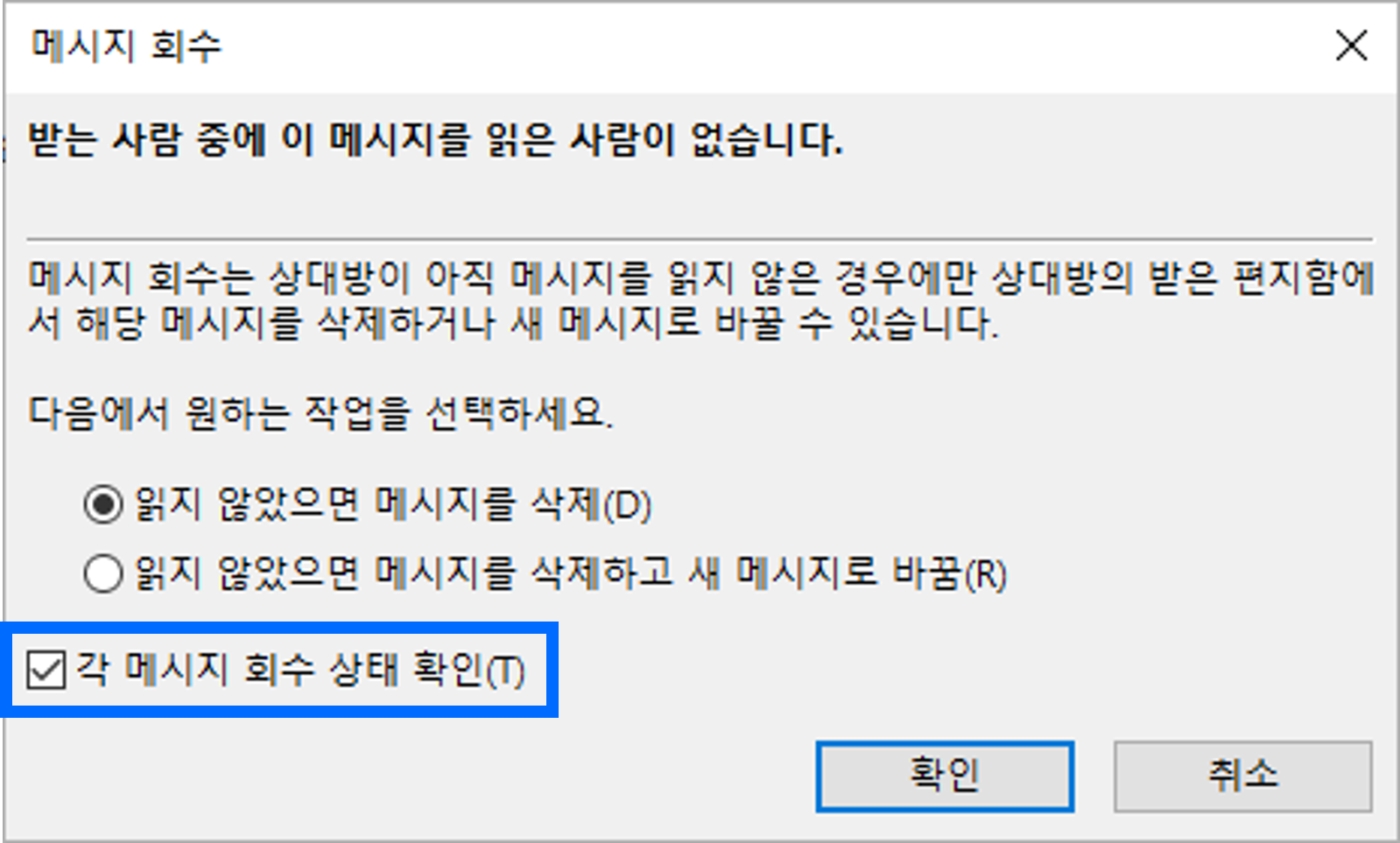 메시지 회수 창에서 원하는 옵션을 선택한 후, 아래쪽에 있는 ✅각 메시지 회수 상태 확인에 체크한 뒤 확인을 눌러줍니다.