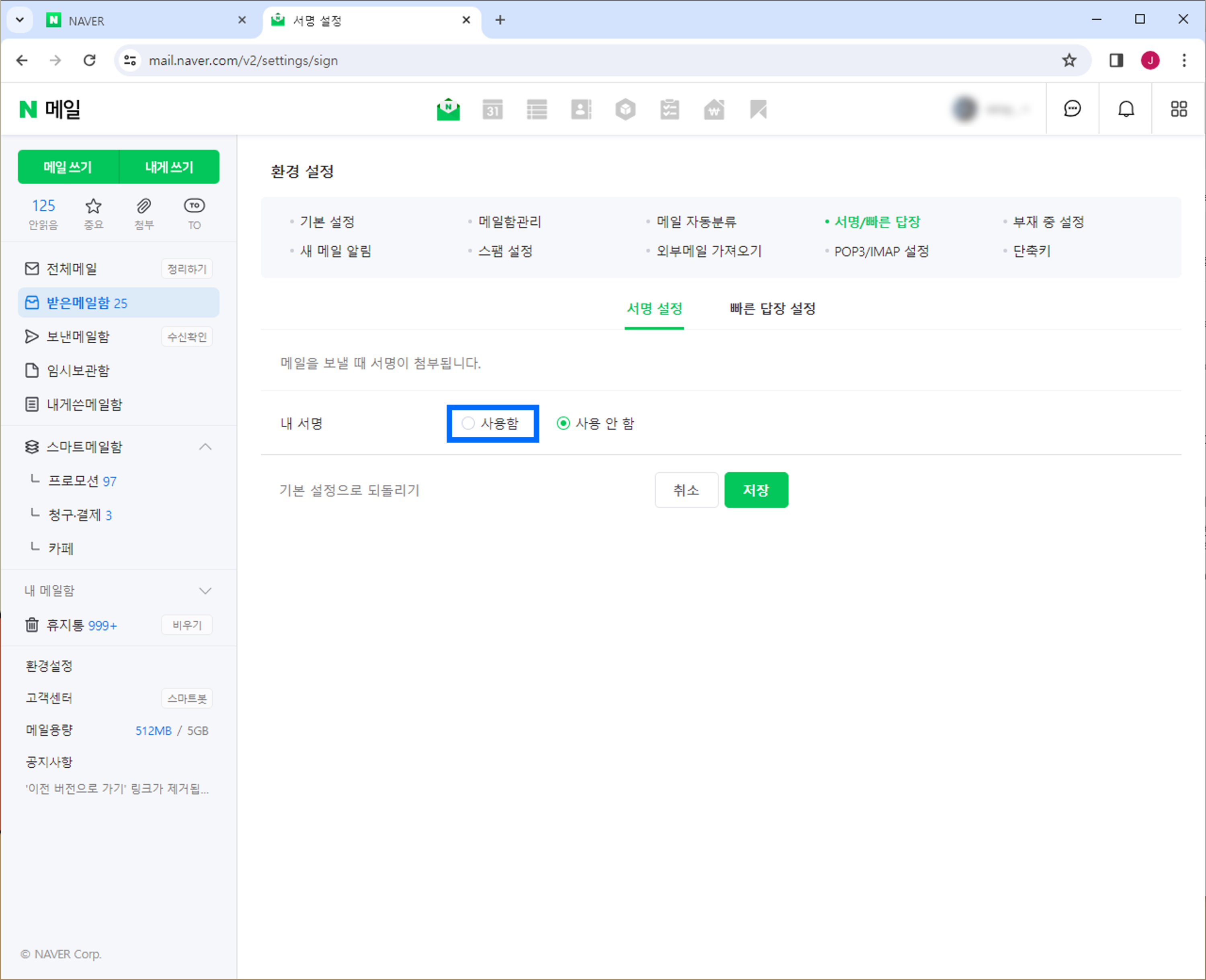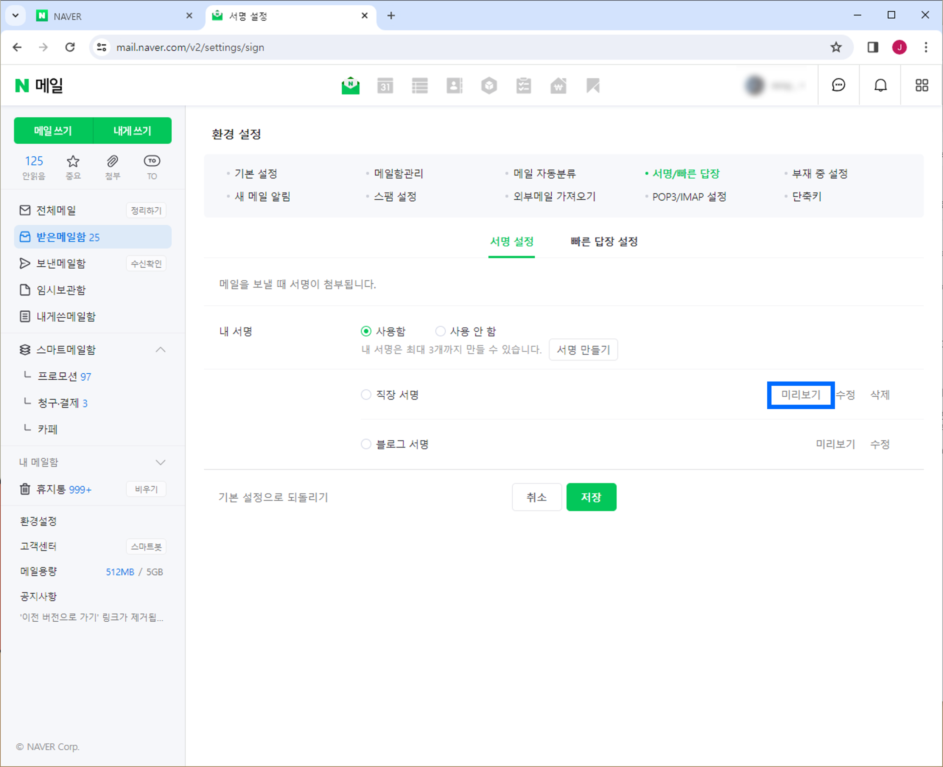 앞서 보여드렸던 서명/빠른 답장 설정 화면으로 이동해주세요.