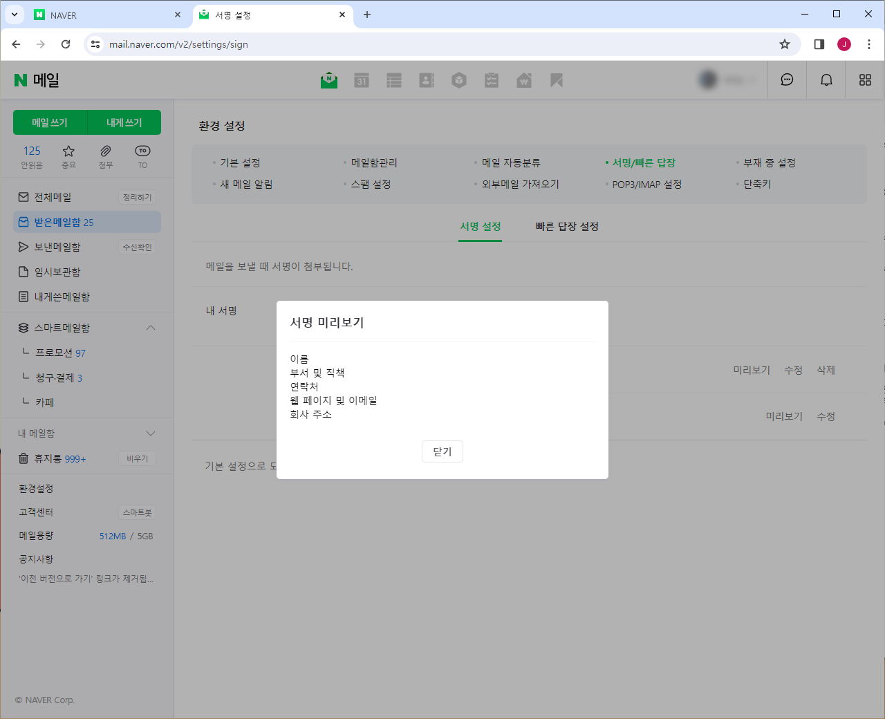(네이버 메일 홈 - 좌측 내 메일함 ⚙톱니바퀴 아이콘 - 상단 메뉴 중 서명/빠른 답장)