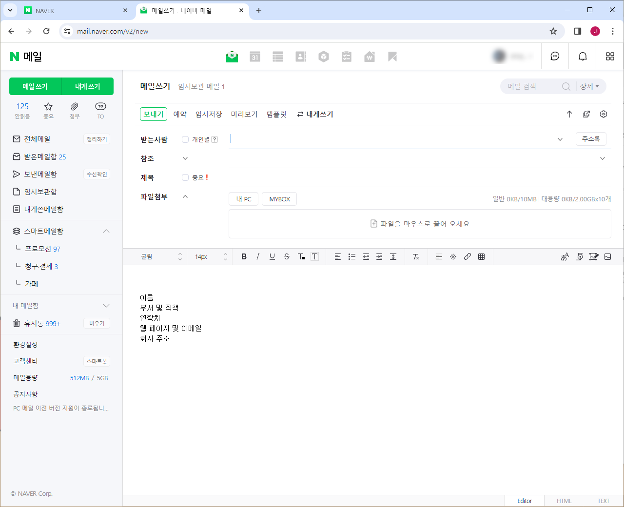 입력한 서명 내용이 위와 같이 나타납니다. 이제 메일 작성으로 이동해서 만들어진 서명이 잘 활용되는지 확인해보도록 하겠습니다.