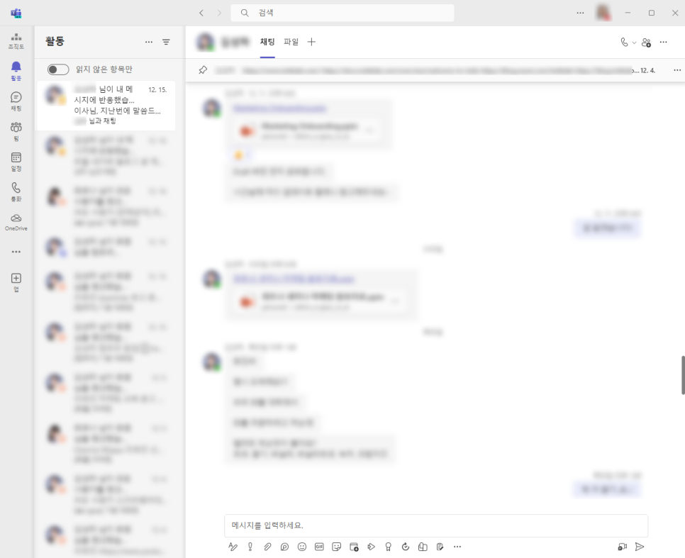 먼저 활동에서는 나와 관련된 것들, 가령 나의 메시지에 대한 다른 사람들의 응답이나 나를 언급한 채팅을 알려줍니다.