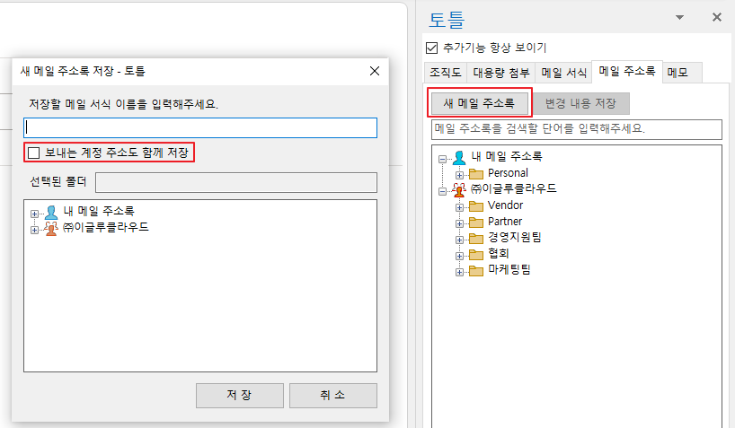 이메일 주소록 저장 시 보내는 주소를 함께 저장하고 싶은 경우에는 이메일 주소록 이름 입력 칸 아래의 보내는 계정 주소도 함께 저장 체크박스에 체크 후 저장을 클릭합니다.