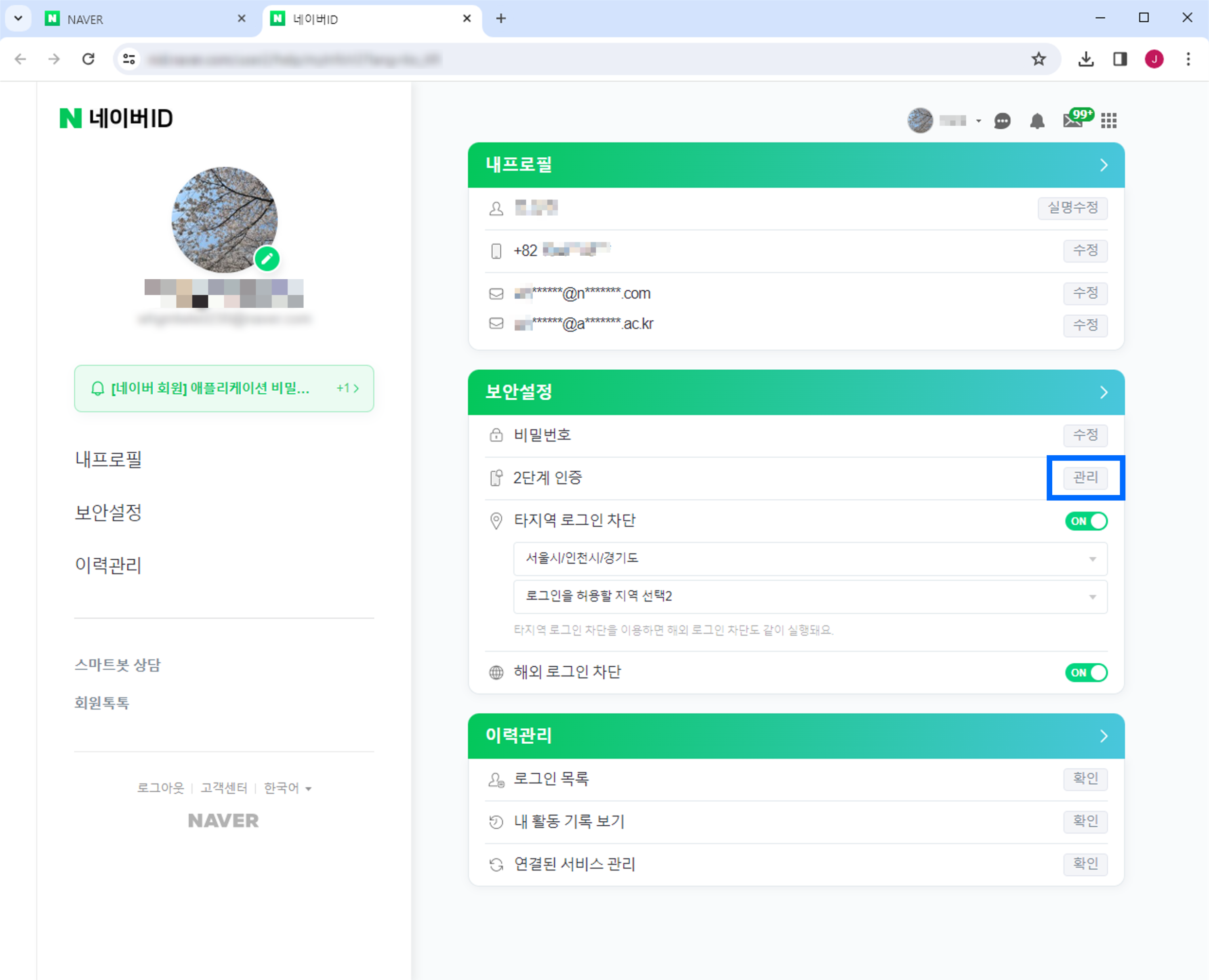 그러면 다음 페이지가 뜨는데요. 두 번째 단락인 보안설정에서 2단계 인증의 관리 버튼을 클릭합니다.