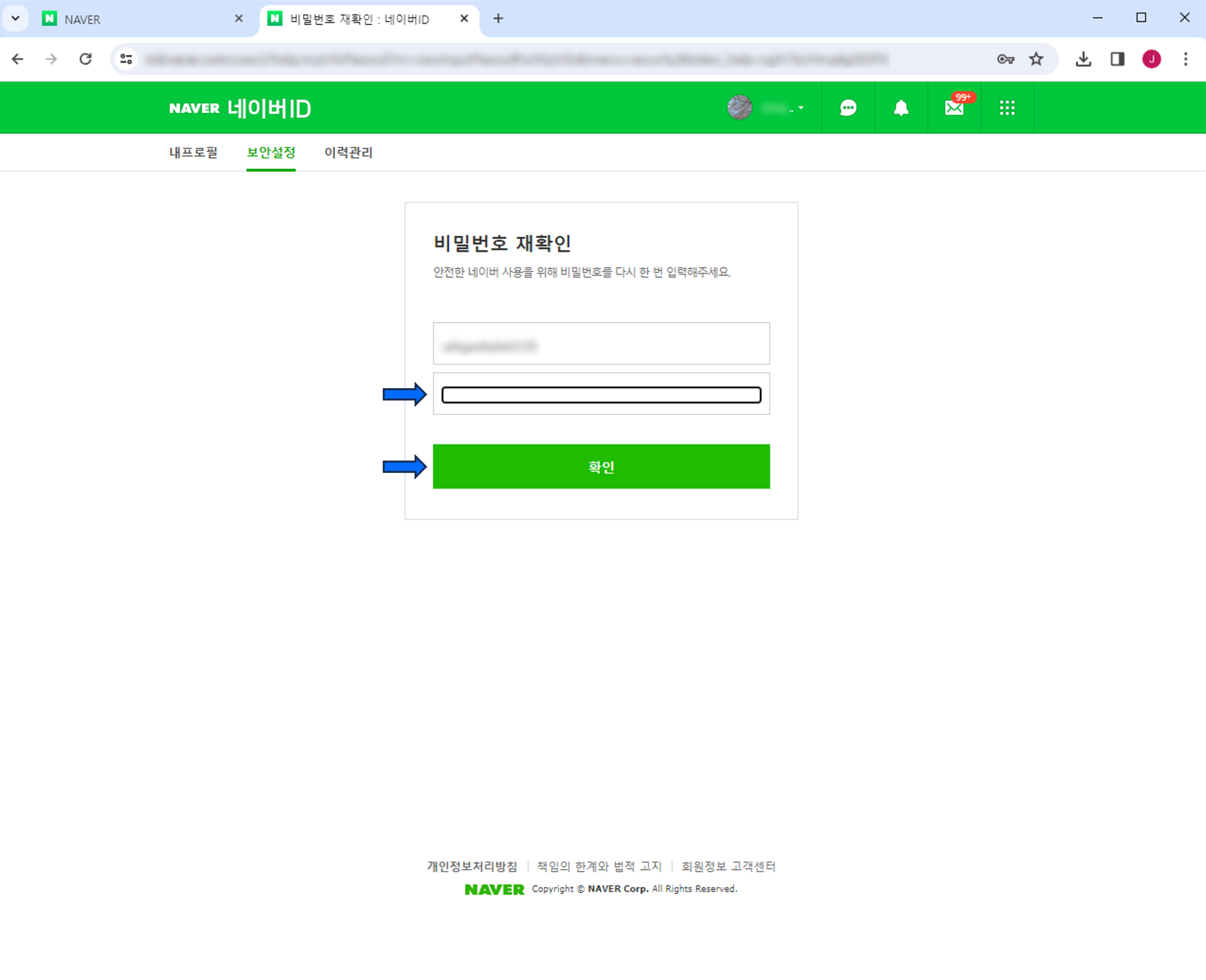 빈칸에 기존 네이버 계정의 비밀번호를 한 번 더 작성한 후 확인 버튼을 눌러줍니다.