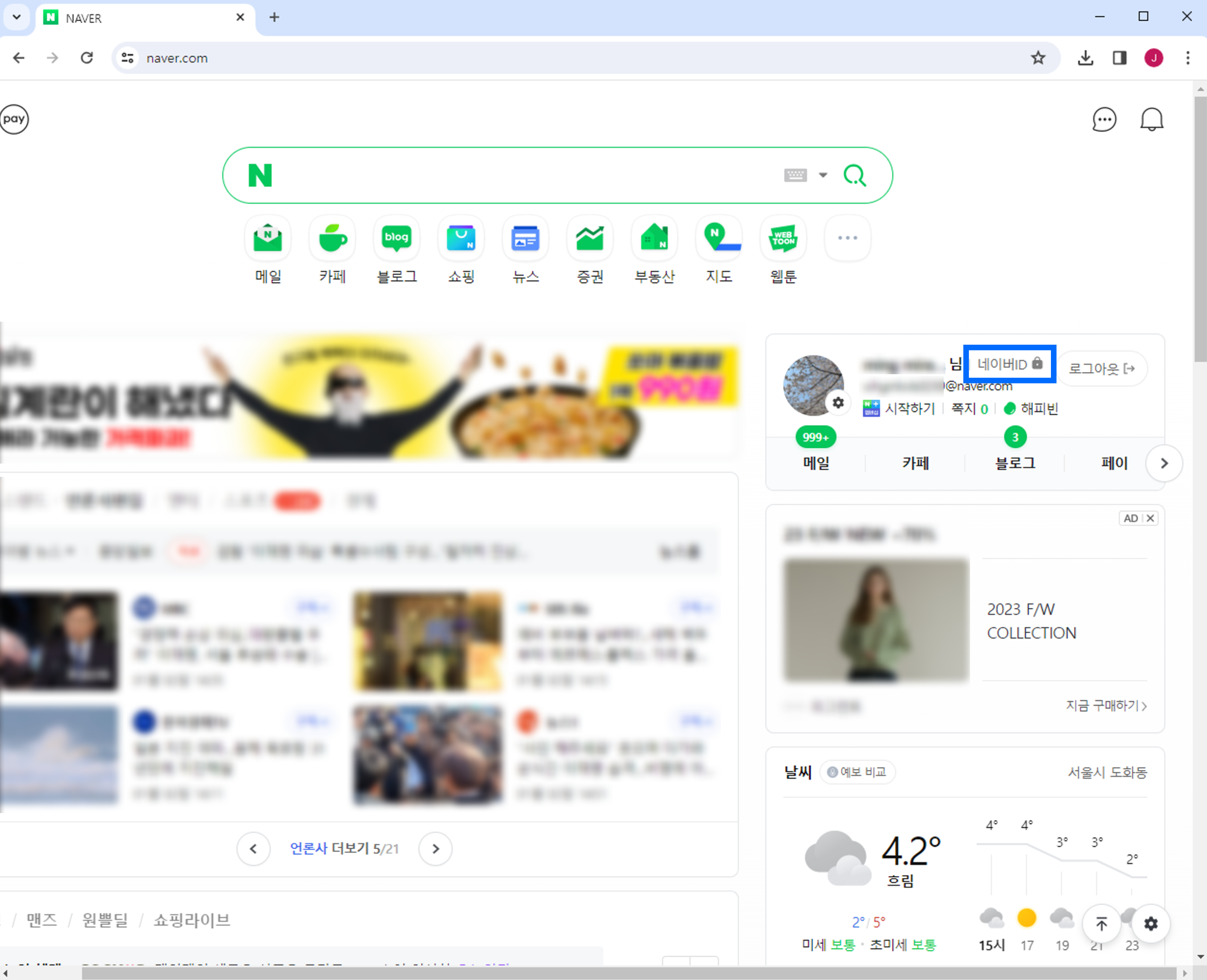 우선 네이버 홈페이지에 접속하여 로그인한 뒤, 파란 박스로 표시된 네이버 ID를 눌러줍니다.