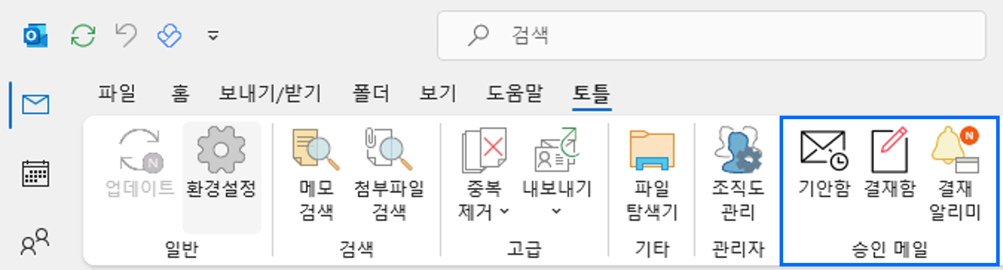아웃룩 홈의 토틀 탭에 들어가면 기안함과 결재함을 각각 확인할 수 있습니다.