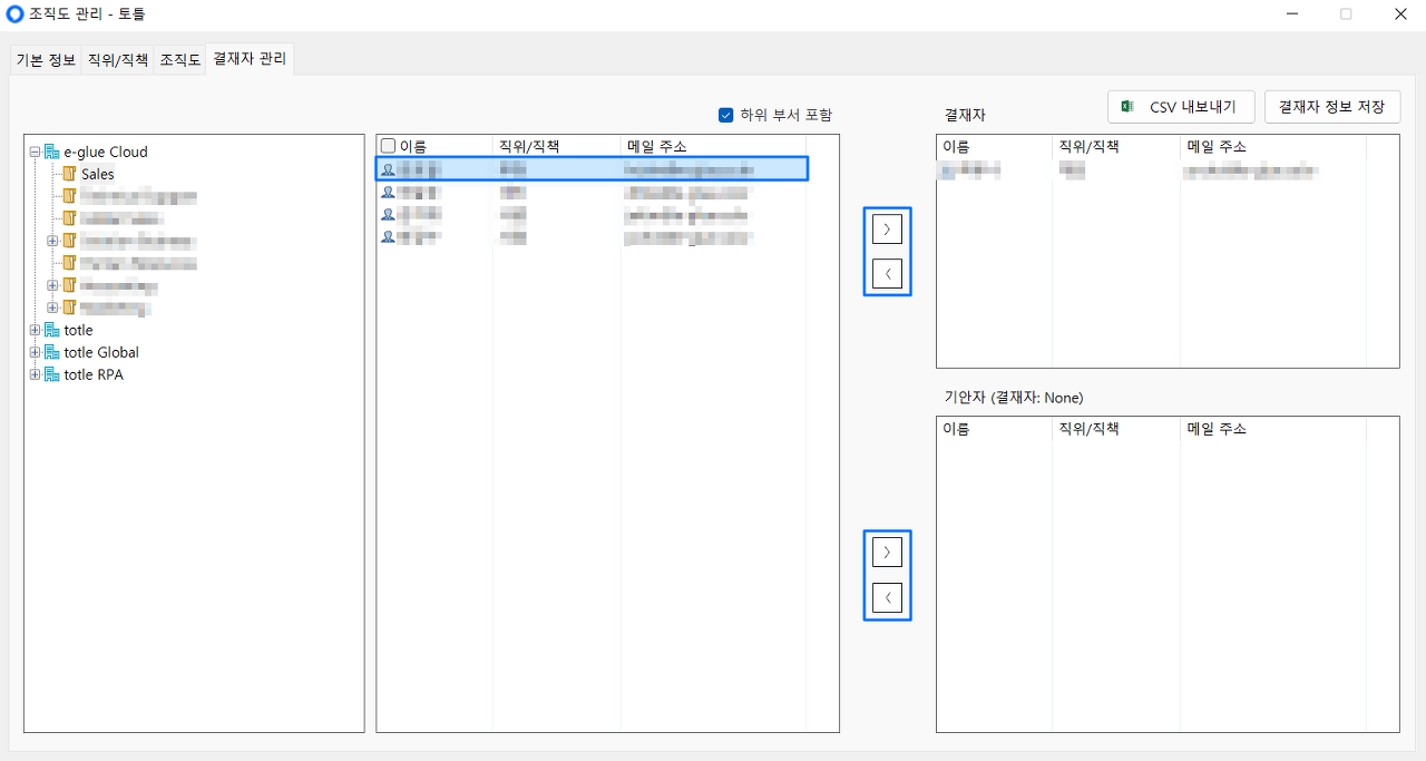 조직도에서 원하는 구성원을 찾아 파란 박스로 표시된 화살표를 눌러 결재자, 또는 기안자 목록에 추가하면 됩니다.