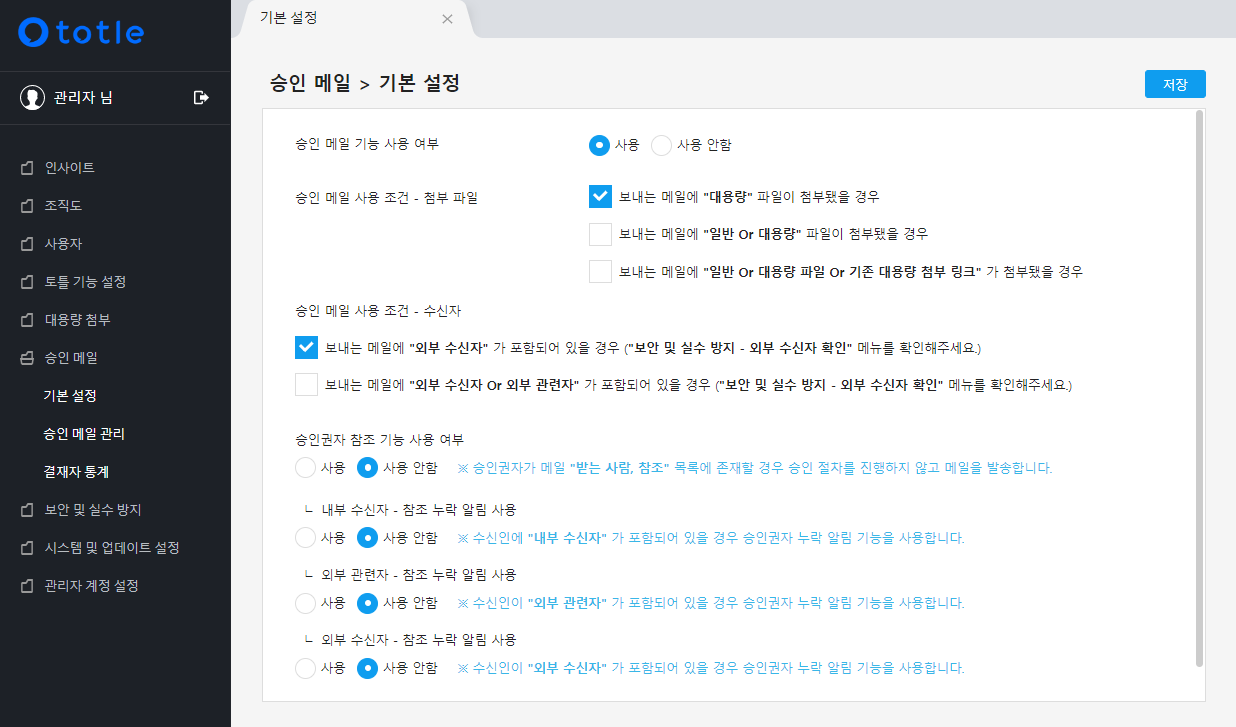 가장 상단에 위치한 ✅사용 버튼을 체크한 뒤, 원하는 옵션으로 승인 메일 사용 조건을 선택할 수 있습니다.