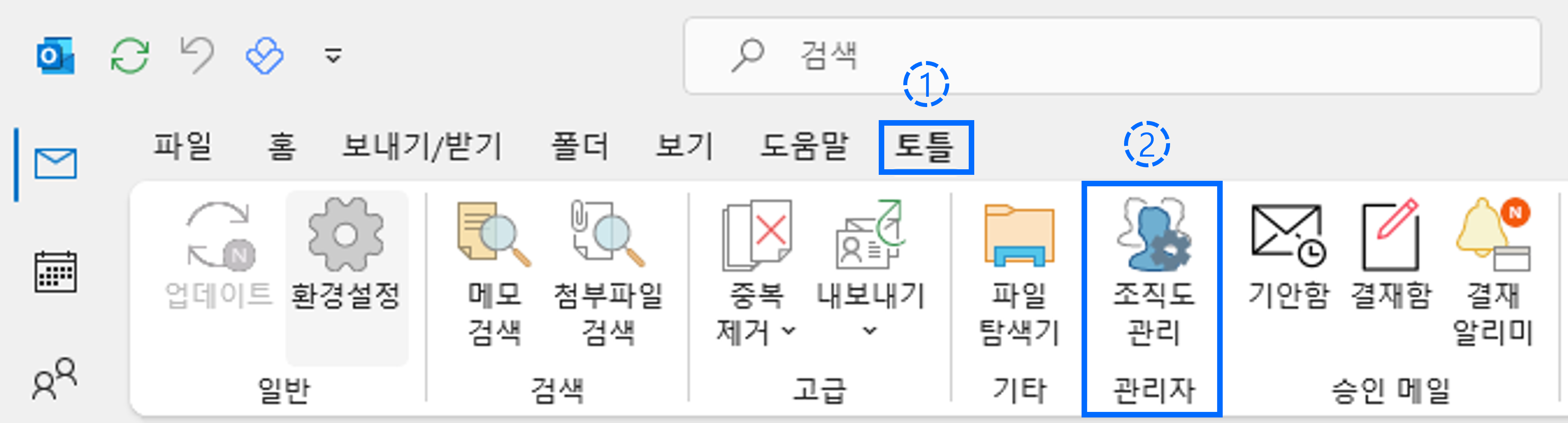 아웃룩 홈 상단에 위치한 토틀 탭으로 들어가서 조직도 관리를 클릭합니다.