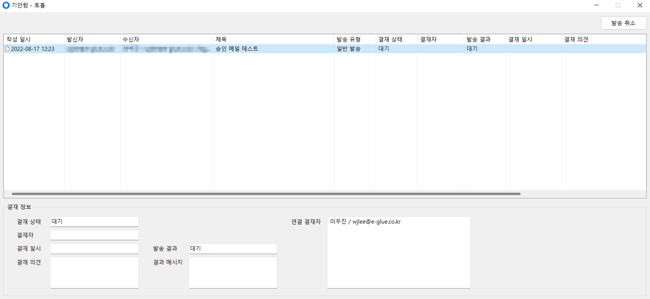 기안함에 접속하면 메일이 작성된 일시, 발신자 및 수신자, 제목을 비롯하여 메일의 상태와 결재 의견까지 한눈에 확인할 수 있습니다.