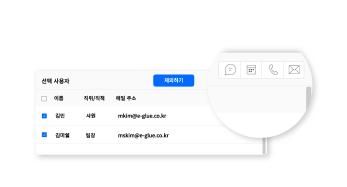 3. 선택 사용자로 이동한 동료 직원들을 선택한 후 원하는 커뮤니케이션 방법을 선택해 소통합니다.