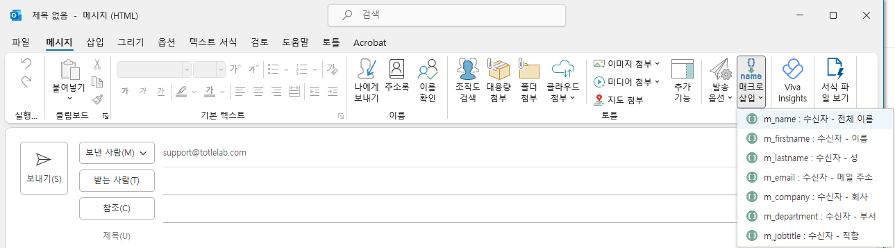 2) 매크로 삽입 메뉴에서 이메일 제목 혹은 본문에 삽입하려는 매크로 값을 클릭해 이메일에 정보를 추가해 줍니다.