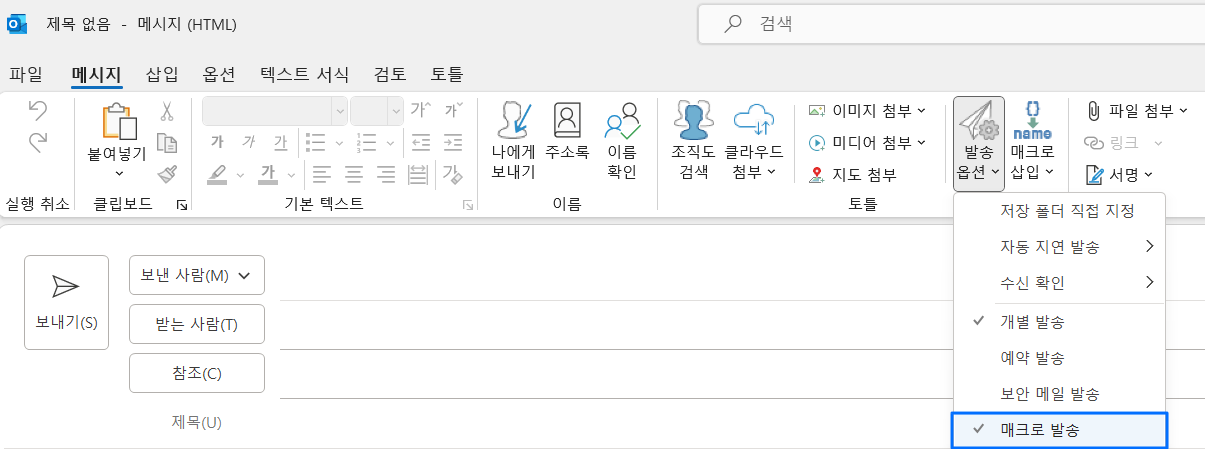 ※ 매크로 발송은 개별발송과 함께 활용할 수 있는 옵션으로 발송옵션에서 매크로 발송을 체크하면 개별 발송이 자동으로 활성화 됩니다.