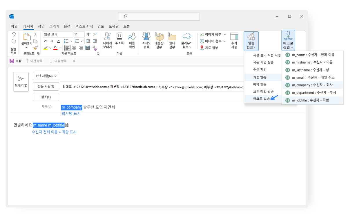 토틀의 매크로 발송 기능을 활용하면 손쉽게 아웃룩에서 개인화 이메일을 발송할 수 있습니다.