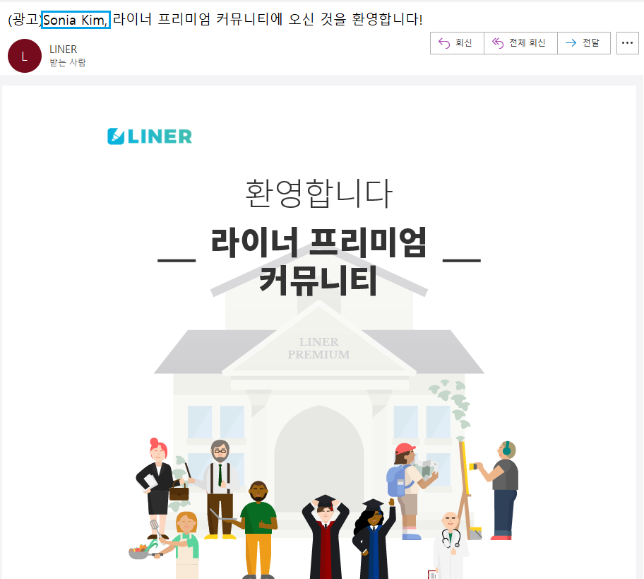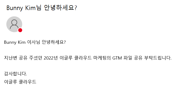 4) 이메일 전송을 완료하면 수신자는 아래와 같이 수신자의 정보가 반영된 이메일을 받아보게 됩니다.