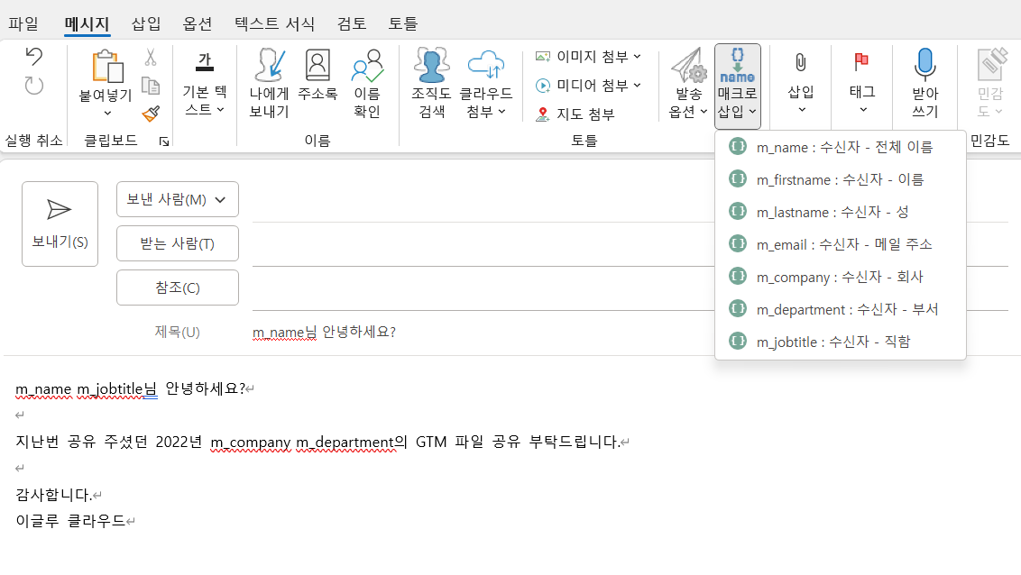 ※ Note: 매크로 발송은 아웃룩의 연락처 정보를 가져옵니다. 이메일에 삽입 할 값이 정확하게 반영될 수 있도록 매크로 발송 기능을 활용하기 전 아웃룩 연락처 정보가 정확하게 업데이트 되었는지 확인해주세요!