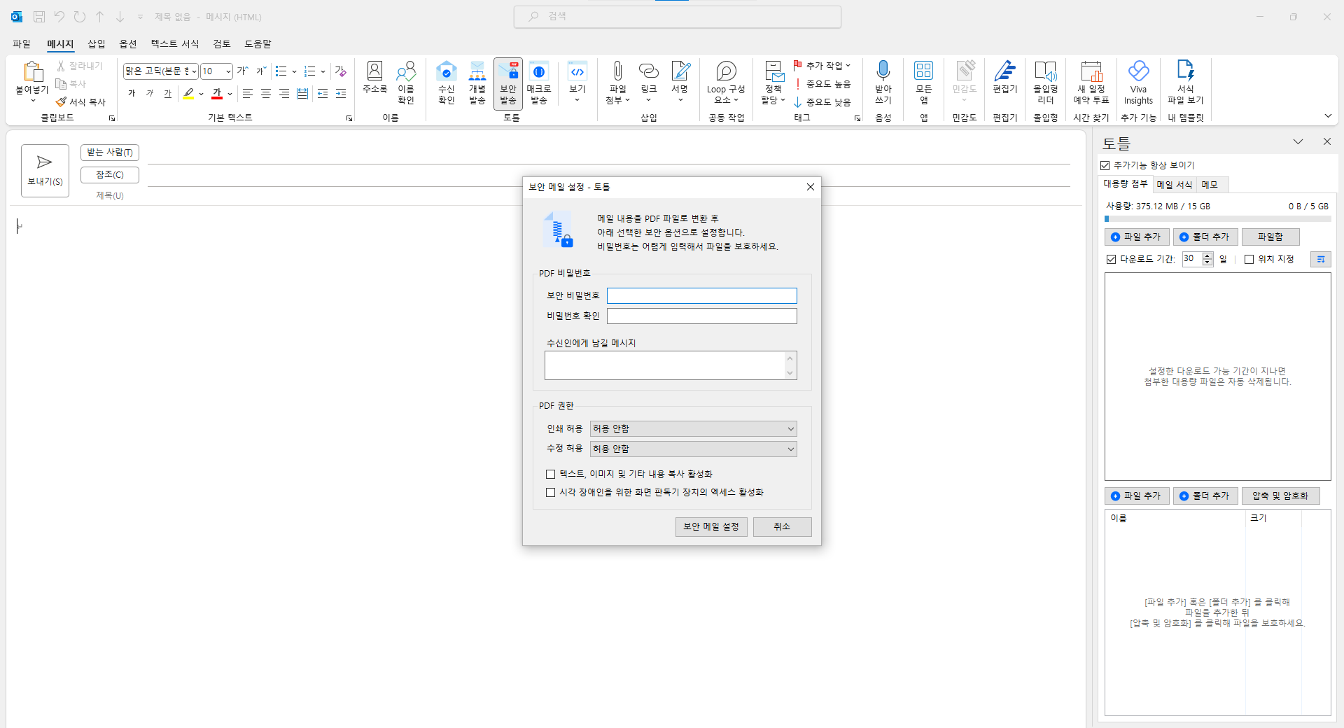 보안 메일 설정 팝업 창이 뜨면 PDF 비밀번호와 수신인에게 남길 메시지를 입력 후 보안 메일 설정을 클릭합니다.