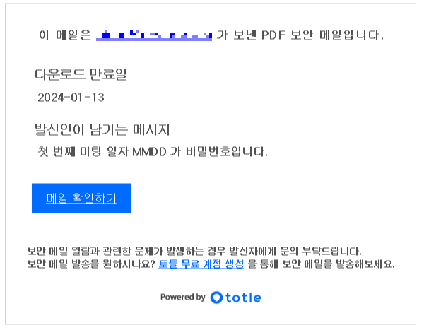 토틀의 보안메일 발송 옵션을 활용하면 보안이 필요한 중요 이메일을 암호화 해 PDF 파일 형태로 이메일을 전송할 수 있습니다. 발신자가 지정한 비밀번호를 입력해야만 이메일을 확인할 수 있어 정보 유출에 대한 우려 없이 이메일을 발송할 수 있습니다.
