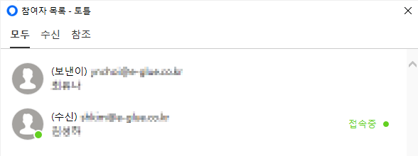 4. 참여자 목록 : 피드백 채팅창 좌측 하단의 참여자 목록을 클릭하면 대화 참여자 목록 및 접속 상태를 조회할 수 있습니다.