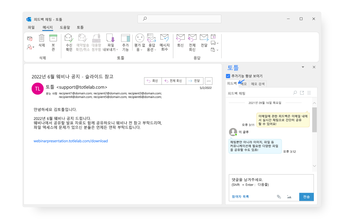 이메일 별로 채팅방이 생성되어 언제든 이메일 발신자 및 수신자 그리고 참조 수신자와 실시간으로 소통하며 빠르게 업무를 처리할 수 있습니다. 피드백 채팅은 이메일 내에서 토틀 사용자 간의 실시간 그 채팅을 지원하는 기능으로 토틀을 활용해 전송한 이메일에 한해 활용할 수 있습니다.