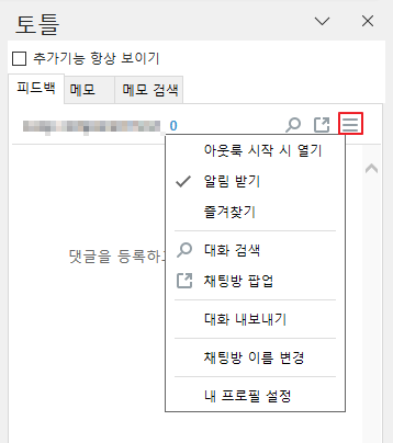 아웃룩 홈 화면 → 상단의 토틀 메뉴 → 피드백 채팅을 클릭하면 피드백 채팅 목록을 확인할 수 있습니다.