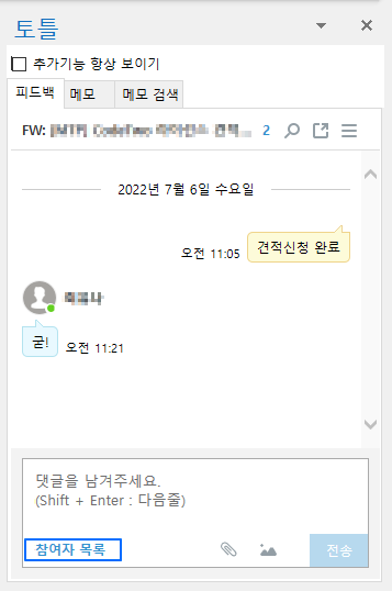 3. 우측의 토틀 패털에서 피드백 탭 하단의 댓글 창에 채팅 내용을 입력 후 전송을 클릭합니다.