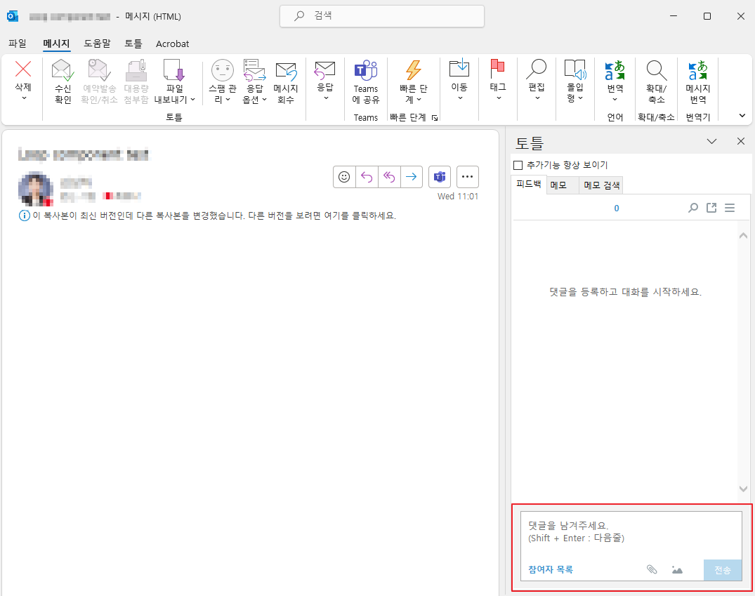1. 아웃룩 받은 편지함 혹은 보낸 편지함에서 피드백 채팅을 시작할 이메일을 선택합니다.