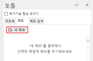 아웃룩 토틀 탭 메뉴의 메모검색을 클릭하면 메모 내용을 손쉽게 확인할 수 있고 메일 열기를 클릭해 메모를 추가한 이메일 또한 검색 및 열람할 수 있습니다.