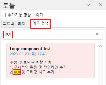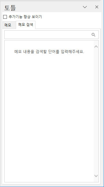 우측의 추가기능 패널에서 메모 검색 탭 클릭해 검색 창에 검색할 단어를 입력 하면 검색 단어와 관련된 메모를 찾을 수 있습니다.