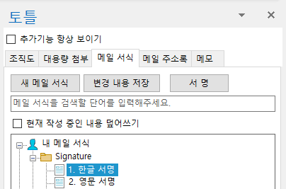4. 우측 패널의 메일 서식 탭의 새 메일 서식을 클릭한 후 메일 서식의 이름을 입력 및 저장해 줍니다.