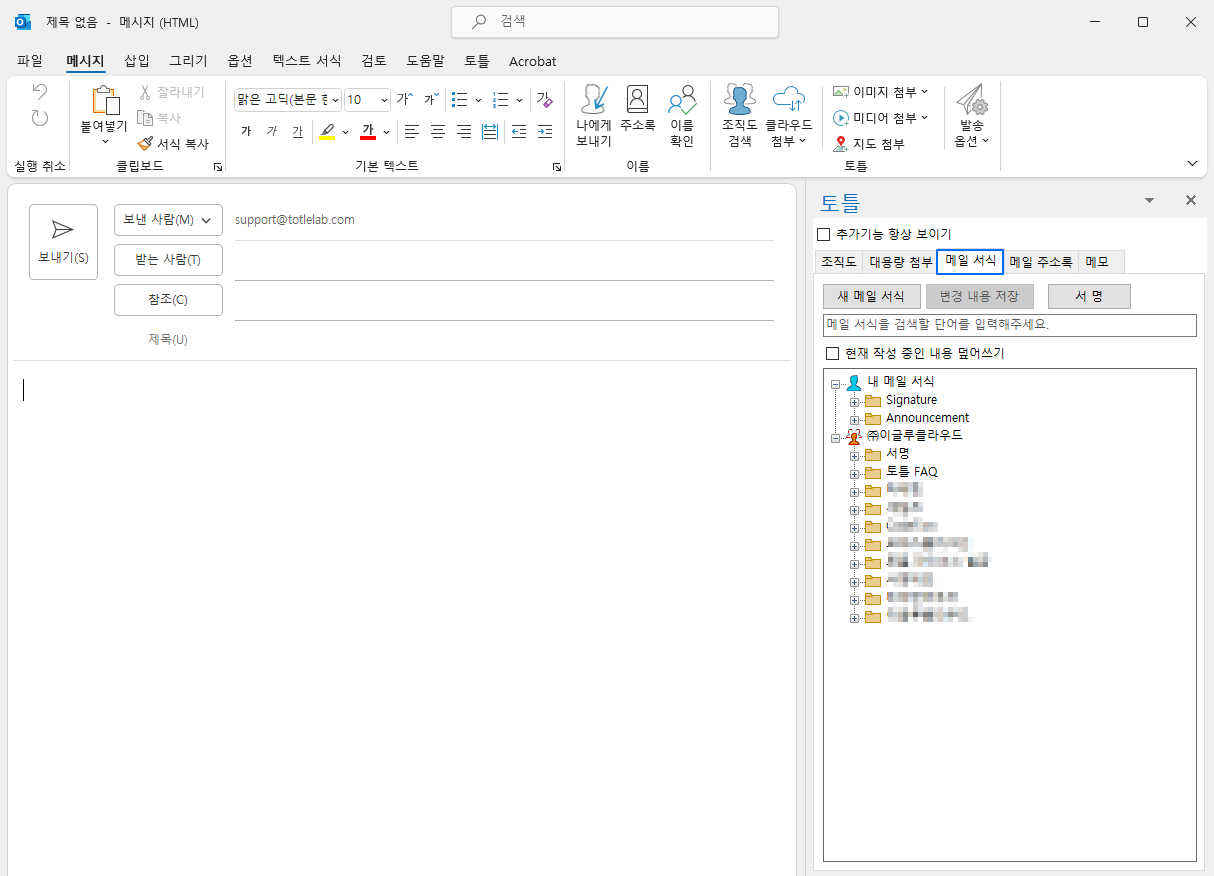 새 전자 메일 → 토틀 추가기능 아이콘 클릭 → 메일 서식을 차례로 클릭한 후 내 메일 서식에서 활용하려는 메일 서식을 더블 클릭해 불러옵니다.