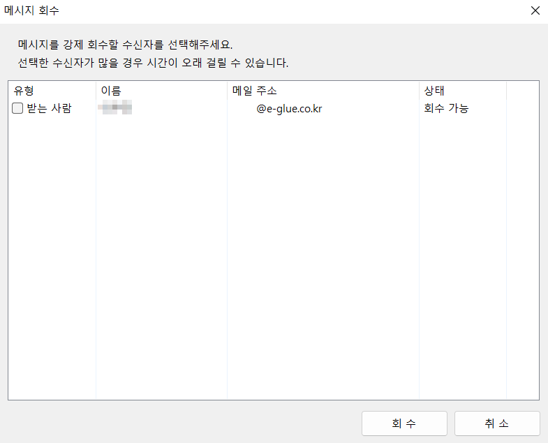 3) 메시지 회수 팝업 창이 뜨면 좌측 유형 열에 받는사람, 참조, 숨은 참조 수신자 정보가 나타나고 회수 가능 여부를 우측의 상태 열에서 확인할 수 있습니다.