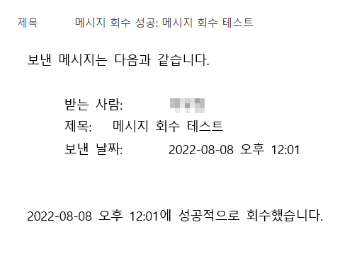 5) 메시지 회수가 성공적으로 완료되었다면 메시지 회수 결과를 알려주는 알림 이메일을 받게 됩니다.