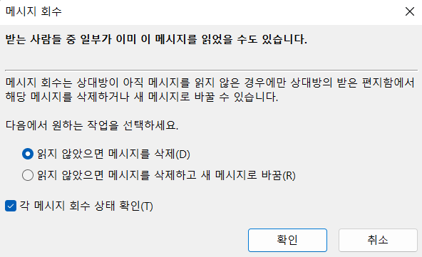 3) 아래 이미지와 같은 메시지 회수 팝업 창이 나타나면 메시지 회수 방법을 체크한 후 확인을 클릭합니다.