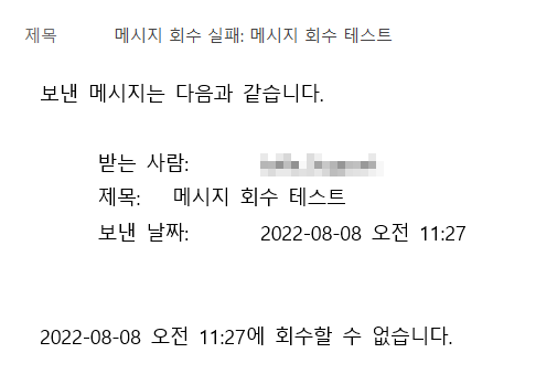 각 메시지 회수 상태 확인(T) 옵션에 체크하면 메시지 회수의 성공 혹은 실패 결과를 이메일로 업데이트해 줍니다.