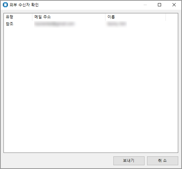 이전 알림창에서 외부 수신인 정보를 확인하지 못한 경우 한번 더 제공되는 이 알림창에서 외부 수신자를 확인하고 보낼 수신자만 빠르게 체크해 이메일을 전송할 수 있습니다.