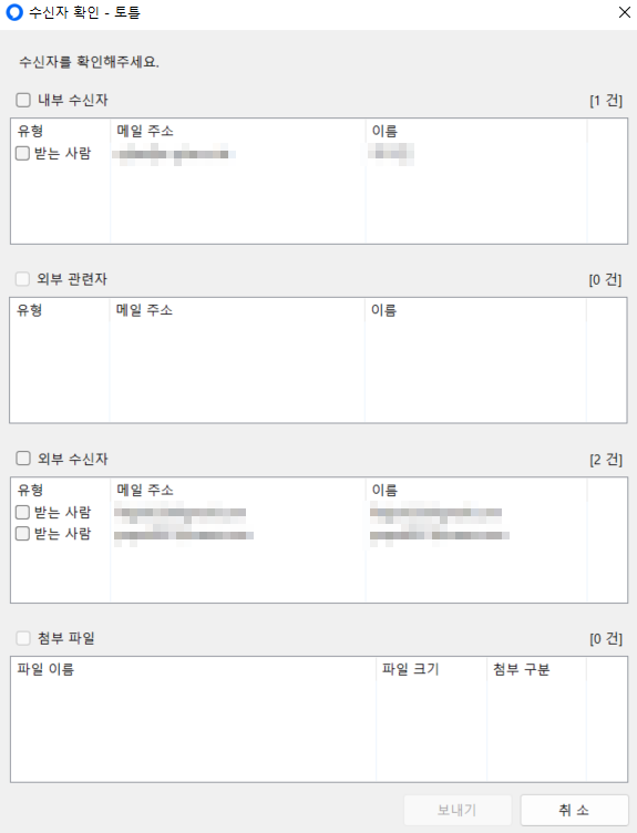 첫 번째로 제공하는 수신자 확인 팝업 창에서는 전체 수신자를 확인할 수 있습니다. 내부 도메인으로 등록된 수신자는 검정색으로 표시되고 그 외의 외부 수신자는 빨간색으로 표시됩니다.