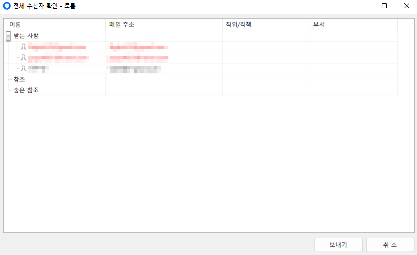 첫 번째로 제공하는 수신자 확인 팝업 창에서는 전체 수신자를 확인할 수 있습니다. 내부 도메인으로 등록된 수신자는 검정색으로 표시되고 그 외의 외부 수신자는 빨간색으로 표시됩니다.