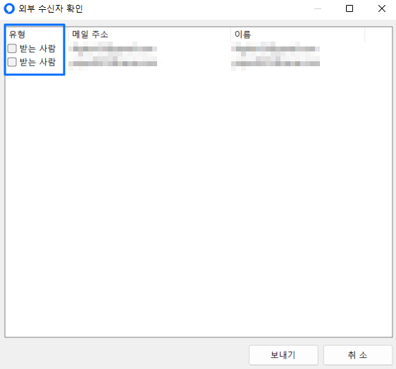 이전 알림창에서 외부 수신인 정보를 확인하지 못한 경우 한번 더 제공되는 이 알림창에서 외부 수신자를 확인하고 보낼 수신자만 빠르게 체크해 이메일을 전송할 수 있습니다.