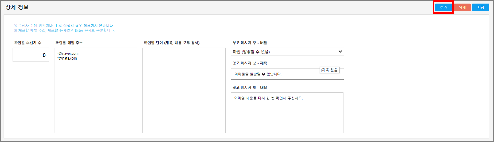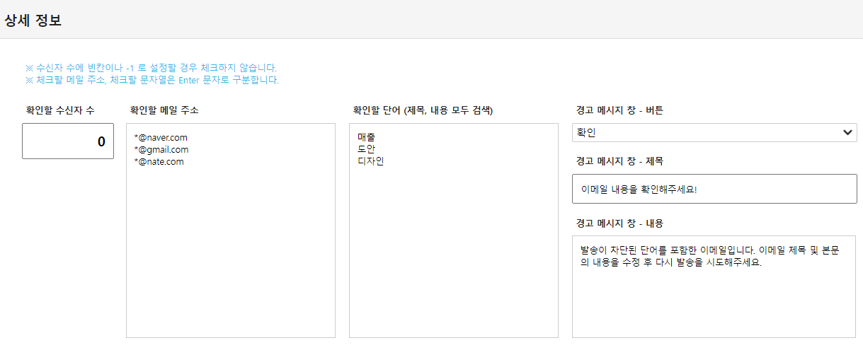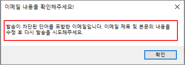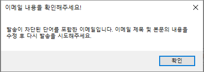 이메일 발송 시 제목 혹은 메일 본문에 특정 단어를 포함한 경우 이메일 발송을 제한하거나 경고 메시지 창을 띄울 수 있습니다.