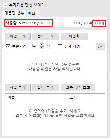 3. 추가 기능 내 대용량 첨부 탭에서 대용량 파일 첨부 사용량과 사용 횟수를 아래와 같이 확인할 수 있습니다.